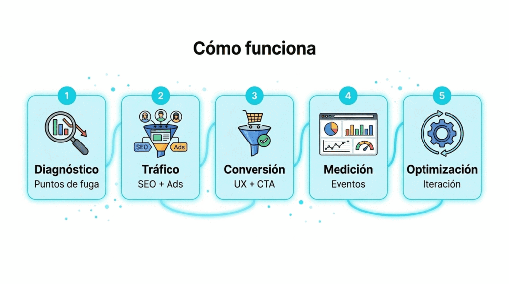 La mayoría de las agencias trabaja por canal (SEO, Ads, redes). Aquí trabajamos un sistema completo enfocado en resultados: tráfico + conversión + medición. No se trata de generar visitas, sino de generar clientes.