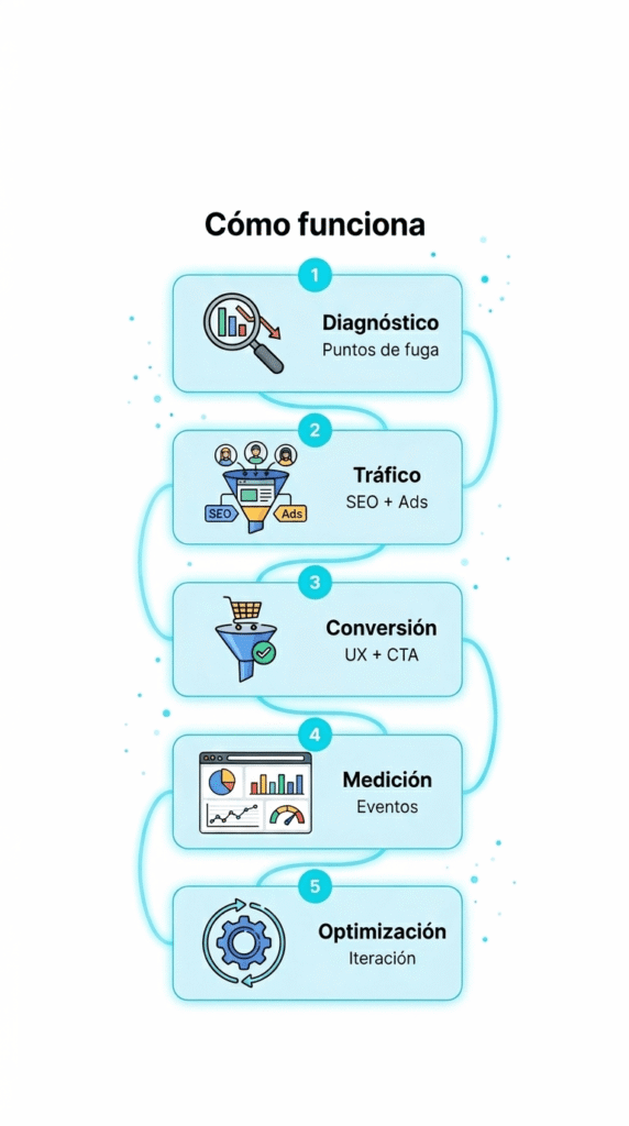 La forma más rápida de saberlo es con un diagnóstico. Analizamos tu sitio, tu tráfico y tu proceso actual para identificar oportunidades reales de mejora. Si hay potencial, te lo mostramos con claridad. Si no, también.